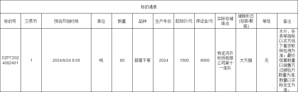 轉(zhuǎn)讓標(biāo)的為苜蓿干草60噸,標(biāo)的存放地位于特泥河農(nóng)牧場(chǎng)有限公司第十一連隊(duì),詳情見標(biāo)的清單: