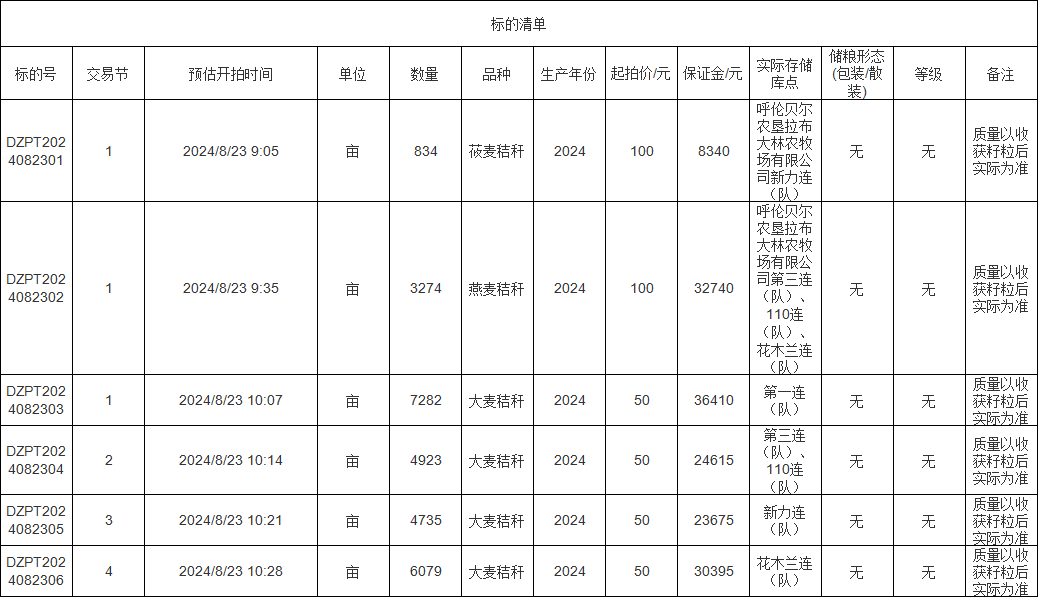 轉(zhuǎn)讓標(biāo)的為莜麥秸稈、燕麥秸稈、大麥秸稈,涉及面積莜麥秸稈834畝、燕麥秸稈3274畝、大麥秸稈(1-4標(biāo))分別為7282畝、4923畝、4735畝、6079畝,意向受讓方在競(jìng)買前應(yīng)自行對(duì)標(biāo)的預(yù)估數(shù)量和質(zhì)量情況進(jìn)行充分了解,交易標(biāo)的均以實(shí)際狀況為準(zhǔn)。標(biāo)的存放地位于呼倫貝爾農(nóng)墾拉布大林農(nóng)牧場(chǎng)有限公司,詳情見標(biāo)的清單: