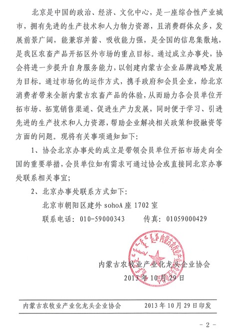 關(guān)于內(nèi)蒙古農(nóng)牧業(yè)產(chǎn)業(yè)化龍頭企業(yè)協(xié)會(huì)成立北京辦事處的通知