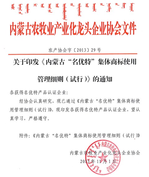 關(guān)于印發(fā)《內(nèi)蒙古“名優(yōu)特”集體商標(biāo)使用管理細(xì)則(試行)的通知》