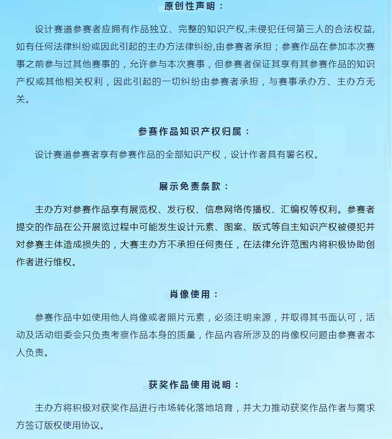 設(shè)計(jì)賽道作品獎(jiǎng)金不包含作品版權(quán),版權(quán)購(gòu)買形式及費(fèi)用由需求單位與獲獎(jiǎng)作者自行協(xié)商確定。
