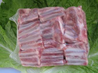 用羔羊肉排作原料,將羊排兩端鋸齊后順兩根肋骨中間方向平行下鋸,鋸成長(zhǎng)寬尺寸為4cm*4cm的正方形。鋸骨完成后去除表面骨渣和肉沫。
