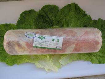 剔骨大羊肉,常規(guī)修肉、去三角線硬皮部分,順紋擺放,脂肪面朝外卷,肥瘦搭配均勻,部分碎肉(小于10%),肉塊順向碼放,按照羊肉的膘情:肥的加200g瘦的加400g,脂肪含量在20%.