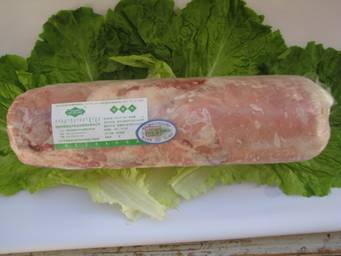 剔骨羔羊胴體羊肉(必須有后腿肉)常規(guī)修肉、去三角線硬皮部分、去掉全部背筋,順紋擺放,瘦肉朝外卷,肥瘦搭配均勻,部分碎肉(小于10%),肉塊順向碼放。