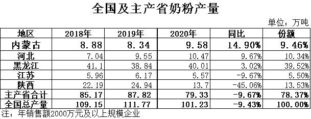 奶粉:根據(jù)國家統(tǒng)計(jì)局?jǐn)?shù)據(jù),2020年全國奶粉產(chǎn)量101.23萬噸,同比下降9.43%,其中黑龍江產(chǎn)量40.01萬噸,同比增長3.02%,占總產(chǎn)量的39.52%,位居全國第一位;內(nèi)蒙古產(chǎn)量9.58萬噸,同比增長14.90%,占總產(chǎn)量的9.46%,位居全國第四位。