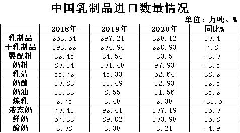 2020年我國共計(jì)進(jìn)口各類乳制品328.12萬噸,同比+10.4%,進(jìn)口額117.06億美元,同比+5.2%,折合生鮮乳1875萬噸,同比+8.3%(干制品按1:8,液態(tài)奶按1:1折算)。