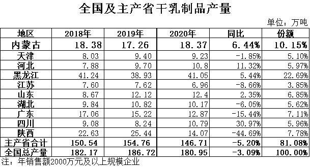干乳制品:根據(jù)國家統(tǒng)計(jì)局?jǐn)?shù)據(jù),2020年全國干乳制品產(chǎn)量180.95萬噸,同比下降3.09%,其中12月份產(chǎn)量16.85萬噸,同比增長4.19%。其中黑龍江產(chǎn)量最高,41.05萬噸,同比增長5.44%,占全國總產(chǎn)量的22.69%位居全國第一位;內(nèi)蒙古產(chǎn)量19.37噸,同比增長6.44%,占全國總產(chǎn)量的10.15%,位居全國第二位。