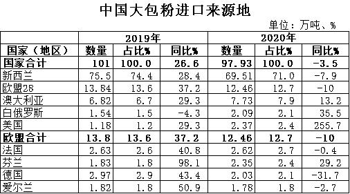 據(jù)中國海關(guān)統(tǒng)計(jì),2020年進(jìn)口大包粉97.93萬噸,同比-3.5%,進(jìn)口額32.91億美元,同比+5.4%,均價(jià)3361美元/噸,同比+9.2%,主要來自新西蘭占71%、歐盟占12.7%、澳大利亞占7.9%。