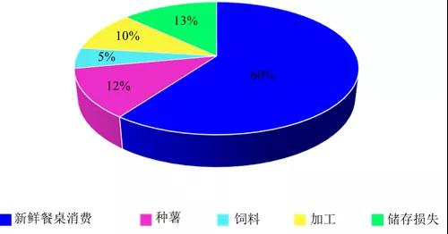 中國(guó)馬鈴薯總消費(fèi)量基本穩(wěn)定,但預(yù)計(jì)未來(lái)十年將略有增長(zhǎng)。業(yè)內(nèi)人士估計(jì),中國(guó)60%的馬鈴薯是在家里或餐館用于鮮食消費(fèi)。這與幾年前相比并沒(méi)有變化,因?yàn)轳R鈴薯仍然是中國(guó)消費(fèi)者的主食。中國(guó)馬鈴薯總量的約10%用于加工業(yè)消費(fèi),12%用于種薯消費(fèi),5%作為飼料消費(fèi),儲(chǔ)藏造成的損失約為13%。根據(jù)《中國(guó)農(nóng)業(yè)展望報(bào)告》預(yù)測(cè),鮮食消費(fèi)的馬鈴薯將年增長(zhǎng)0.3%,加工消費(fèi)的馬鈴薯將年增長(zhǎng)1.3%,飼料消費(fèi)將年增長(zhǎng)0.5%,種薯消費(fèi)和儲(chǔ)藏?fù)p失每年將分別增加1.1%(圖3)。